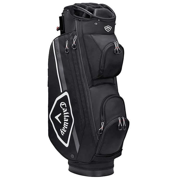 | Callaway Chev 14+ Golf Cart Bag Mid Size Construction With Greater Storage A best selling lightweight trolley bag from Callaway Golf, the Chev 14+ Cart Bag is designed to fill all requirements the cart bag player needs with lightweight design. Featuring a new 14 way graphite friendly divider system with molded easy grab handles, the Chev 14+ Cart bag offers exceptional club organisation while the ‘E’ trolley friendly base allows the bag to fit perfectly on either pull or electric trolleys. The bag features 8 pockets which include and range of water resistant valuables pockets, full length pockets & more. An extremely well designed bag with designated top divider putter section, umbrella loop, glove attachment and grab handle. The Callaway Chev 14+ Cart Bag is a stylish and functional cart bag. |